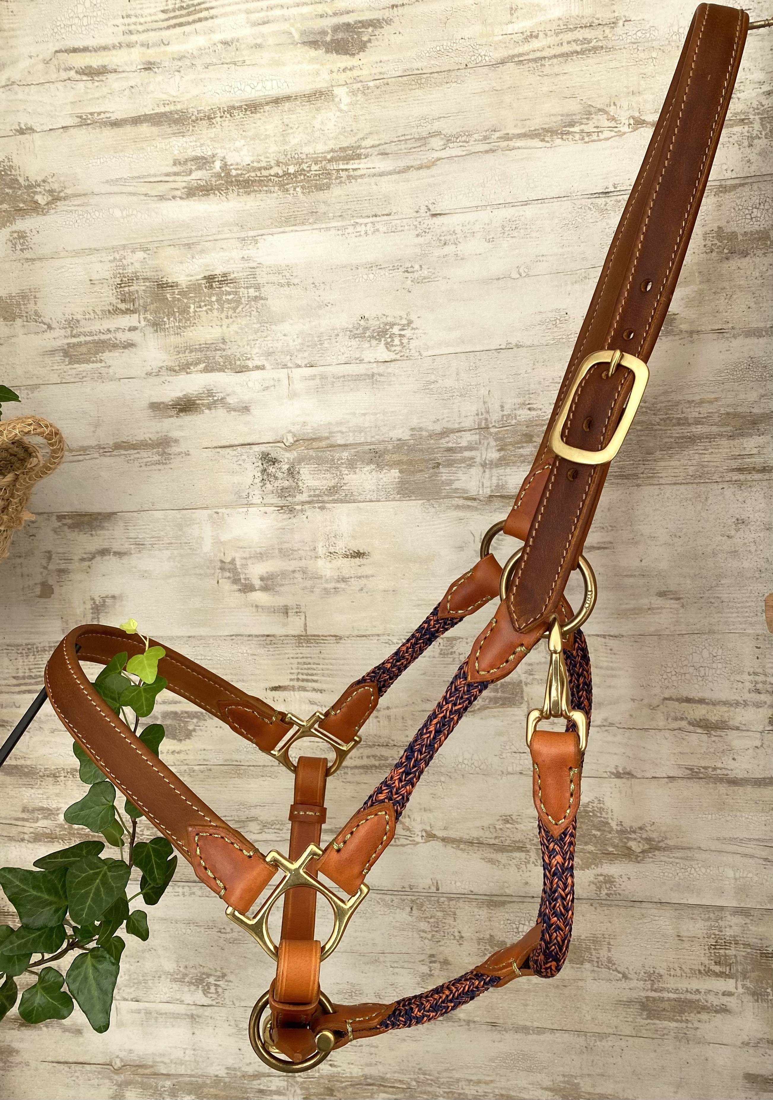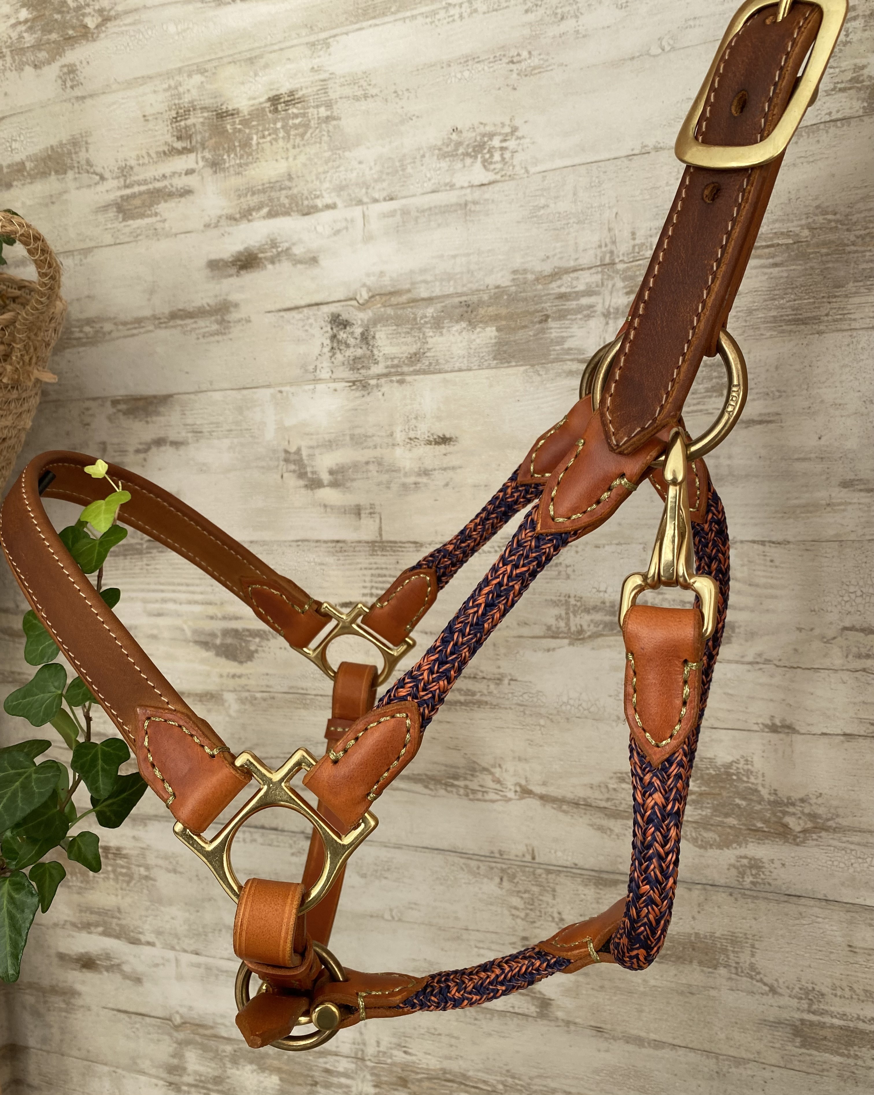 >> Licol cuir caramel et corde 12mm chinée orange/marine