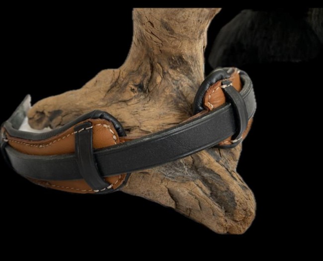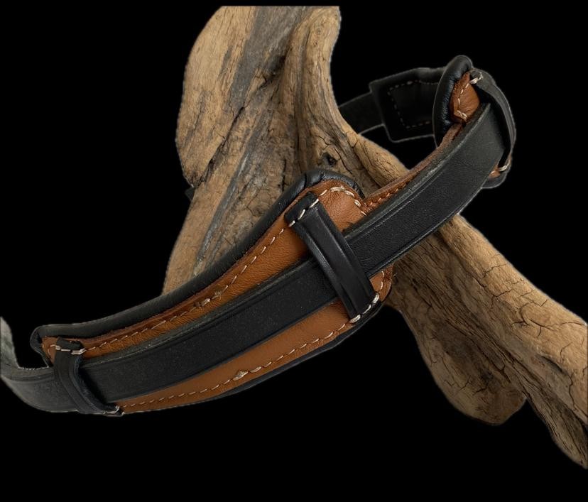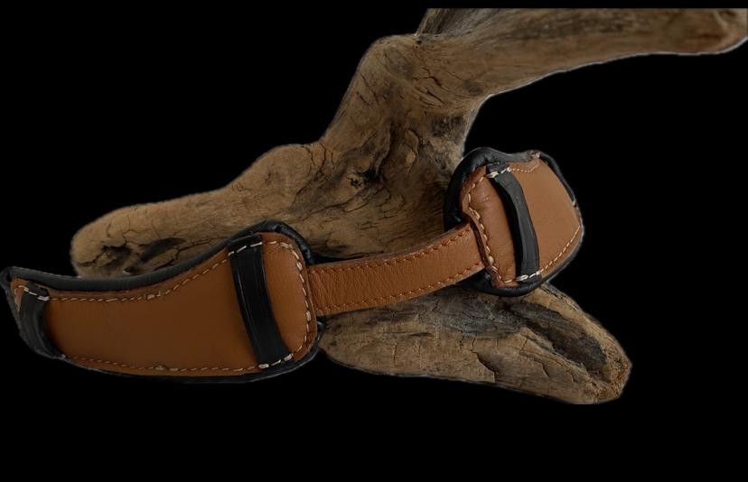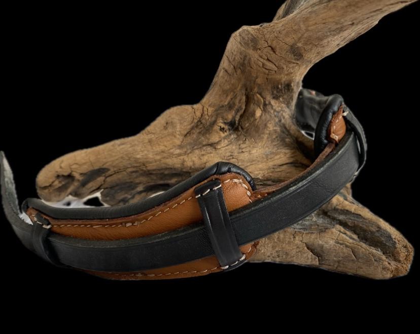 Il est réalisé avec le cuir caramel doublé en noir. Il est cousu avec du fil beige.